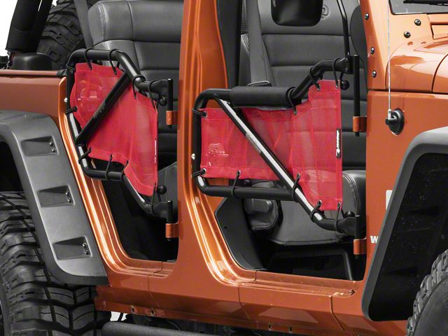 Application. The Steinjager Front & Rear Tube Doors - Black & Red Mesh fit 2007-2018 Jeep Wrangler JK 4 door models.