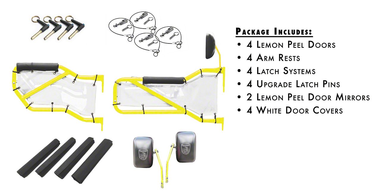 Made in America. To guarantee top-notch reliability, these doors are constructed in America from 1.25 in. OD and .086 wall A22H tubing that is made from the strongest cold-formed steel. Featuring white mesh accents as well as standard and premium latches for improved safety, these doors are designed for superior form and function. Finished with a lemon peel coat that adds a traffic-stopping yellow accent to your Jeep, these doors will let other drivers know just how serious you are about the time you spend off road.