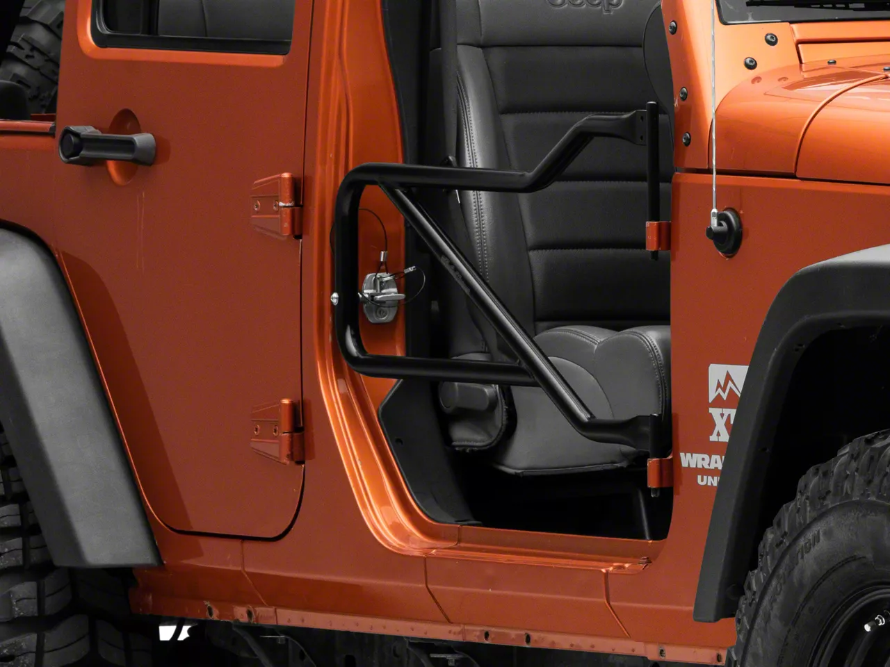 Rugged Construction. Steinjager Front Trail Tube Doors are manufactured from durable 1.25-inch steel tubing. Door hinges are custom-machined for quick switching from the factory to the trail door. The entire unit is then finished in a tough black powder coating for increased protection against rust. Steinjager Front Trail Tube Doors are also available in other colors so you can match the trail door to your Jeep.