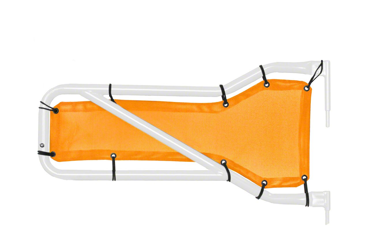 Orange Style by Steinjager. The Steinjager Front Tube Door Mesh Covers - Orange are a striking visual upgrade for your tube doors, using high-strength mesh material supported by 20 bungee balls to keep them in place. Plus, they add an extra layer of protection, preventing some debris and off-road dust from going inside of your vehicle.