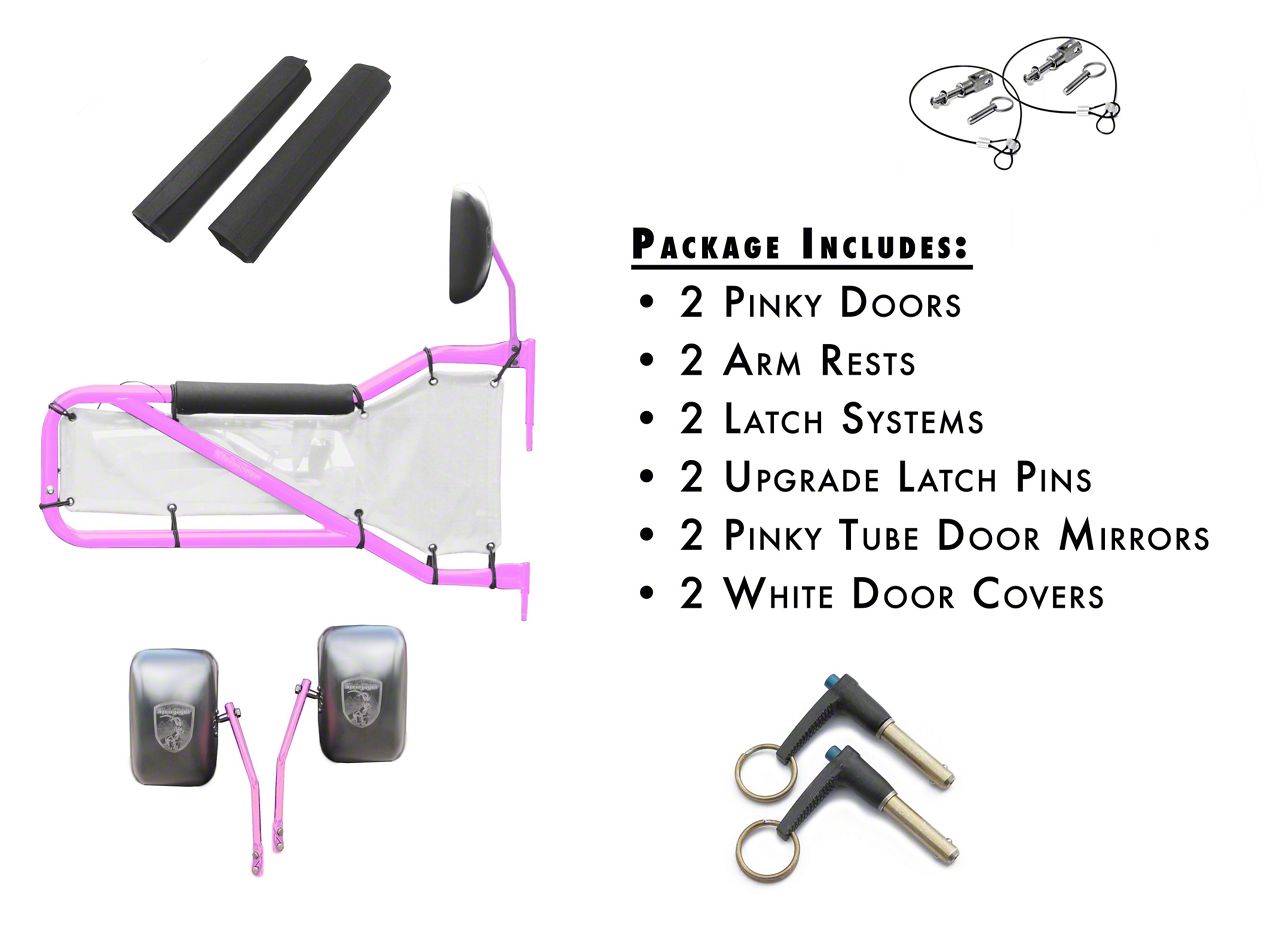 Application. This pair of Steinjager Front Tube Doors with Pinky & White Mesh was designed for installation on 2007-2018 Jeep Wrangler JK models. Driver and passenger side doors are included in the package.