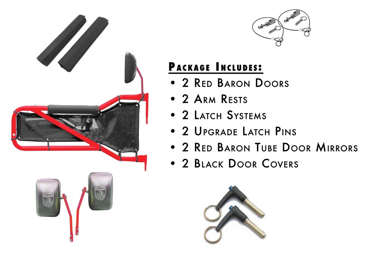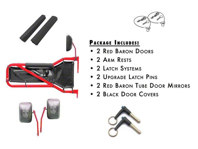 Heavy-Duty Construction. This Steinjager Front Tube Door Kit is made from high-quality materials to ensure maximum durability. Constructed from first-rate steel, these front tube doors are designed to increase safety in open-air driving. What’s more, the red baron powder coat finish and black mesh combination ensures that your Wrangler also delivers in style.