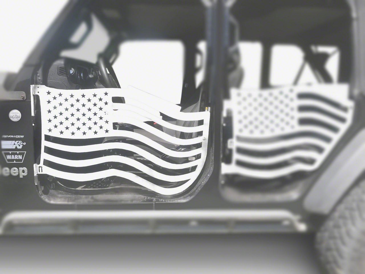 Application. These Premium American Flag Front Trail Doors with a Cloud White finish are made to fit Jeep Gladiator models.