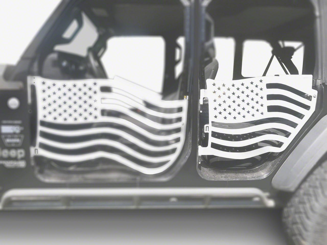 Construction and Features. Made from 3/16-inch steel, these trail doors are designed to withstand rugged conditions, offering both strength and style. The Cloud White finish and American Flag design make these doors a standout feature, while their robust construction ensures long-lasting performance and protection on and off the road.