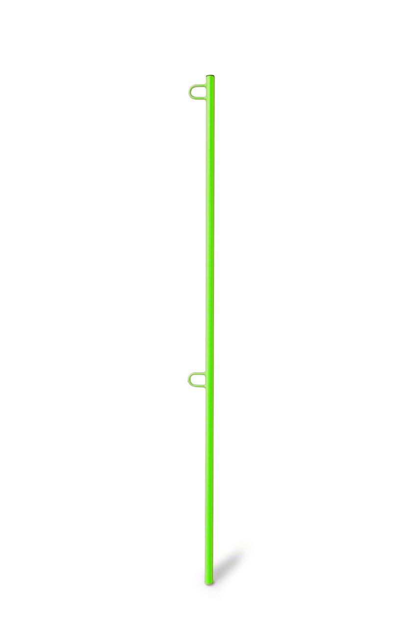 Construction and Design. This Flag Pole Kit is made from 1 inch OD x .120 inch wall tubing. Its neon green finish blends and there's a plastic cap at the top of the pole to keep water and dirt out. The spacing between loops is 34 inches, which means you can hang a variety of flags.