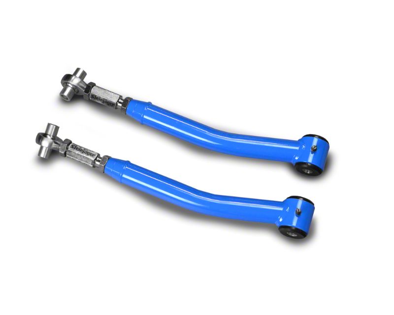 Power and Stability. Enhance your Jeep Wrangler’s directional stability by using these Steinjager Double Adjustable Playboy Blue Rear Upper Control Arms for 0 to 5-Inch Lifts. These control arms offer full range of motion and maximum articulation for better steering stability. With their double adjustability function, as well as their durable chrome rod ends and bushings, these control arms ensure optimum caster angle and proper anti-squat geometry for precise suspension alignment.