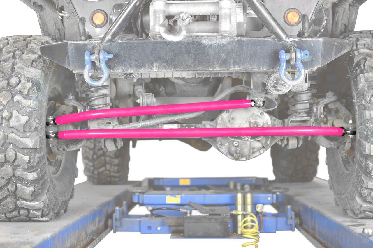 High-Strength Construction. This steering system consists of a reinforced tie rod and drag link made of heavy-duty, 1.50-inch DOM tubing with a .25-inch wall. These components are furnished with .75-inch chrome moly ends, which were heat-treated for improved tensile strength. Additionally, the tubes are fortified by a vivid, pink powder-coated finish for long-lasting corrosion resistance, while adding a brilliant accent to your TJ’s rugged stance.