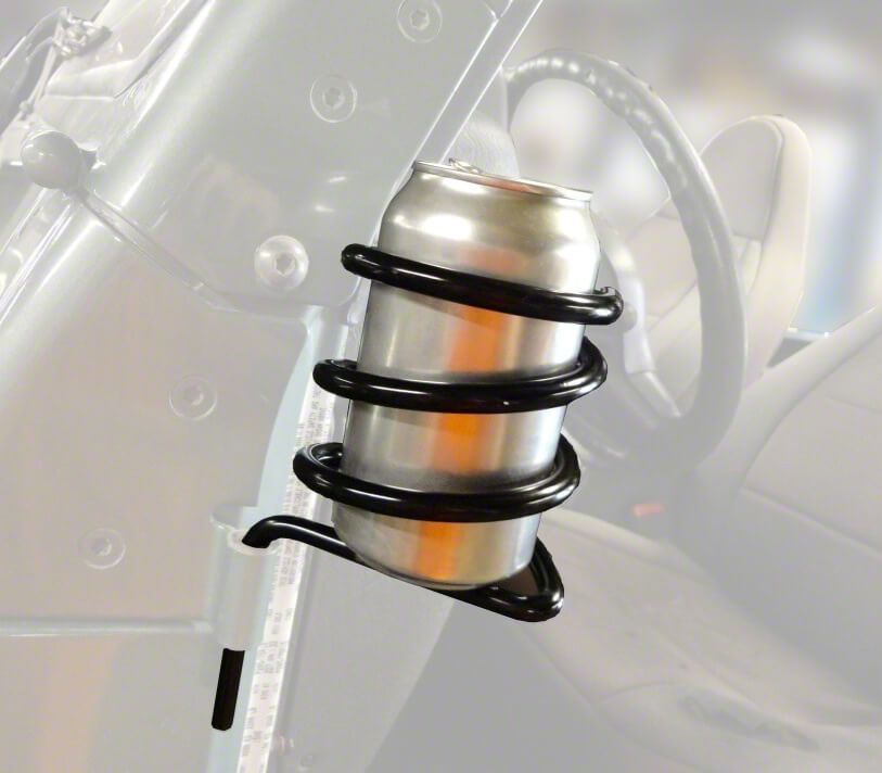 ONE PIECE 12 OUNCE CAN HOLDER, HINGE MOUNT, FITS IN THE UPPER DOOR HINGE OF THE JEEP CJ-7 1976-1986