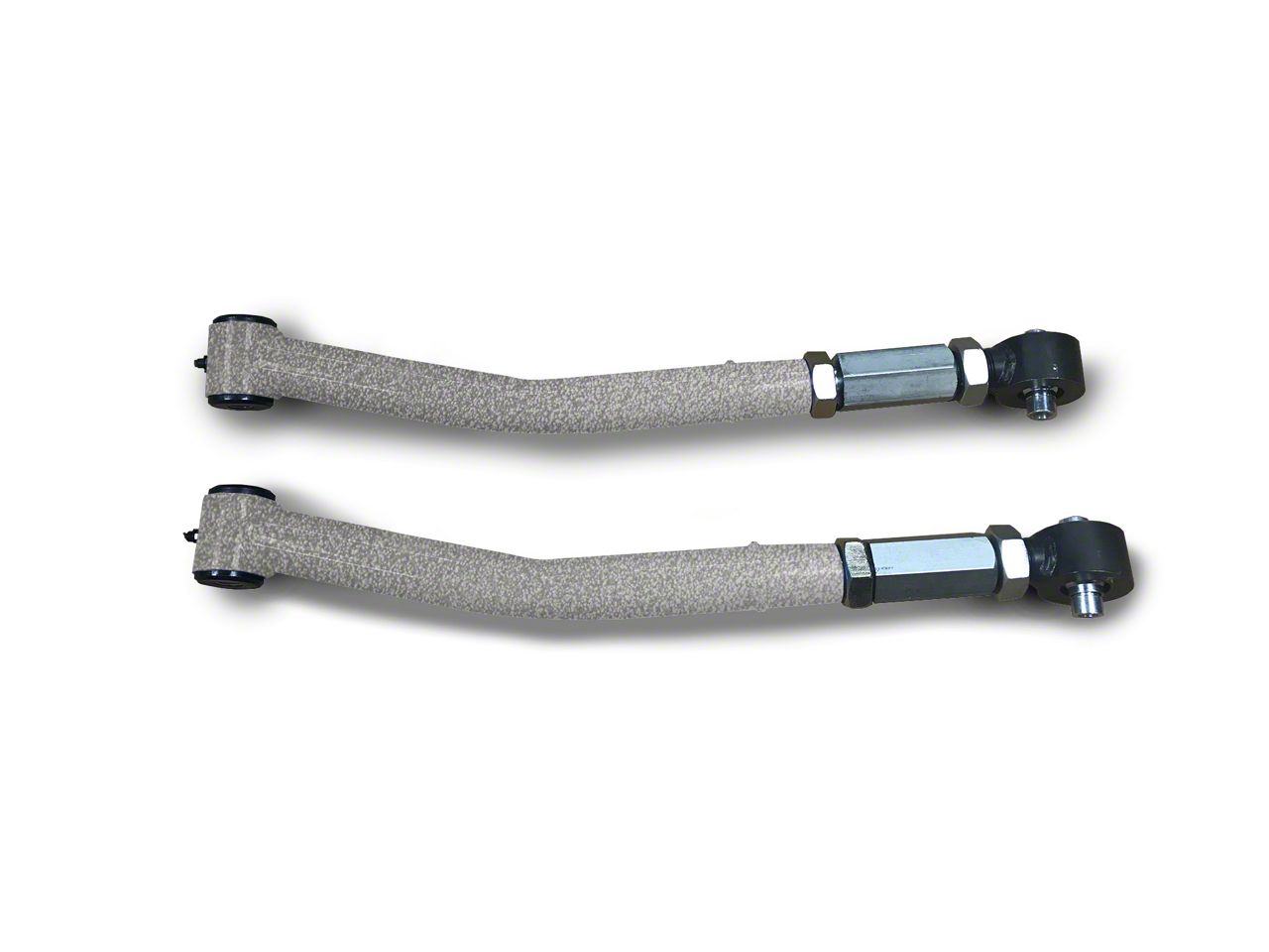 These Front Lower Control Arms replace your worn out factory control arms. They are designed to fit Jeeps ranging from stock height to a 5" suspension lift. The control arms are double adjustable allowing you to dial in your control arm length to suit your application. They are made in the USA utilizing polyurethane bushings on one end and a rebuildable Steinjager joint on the other.