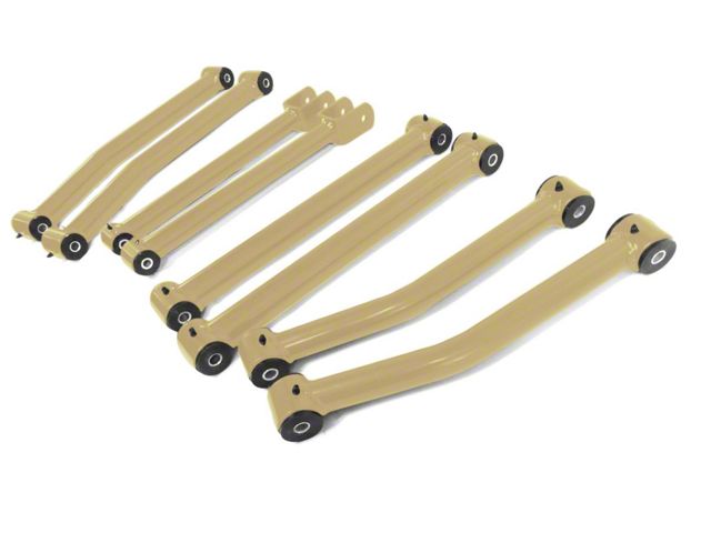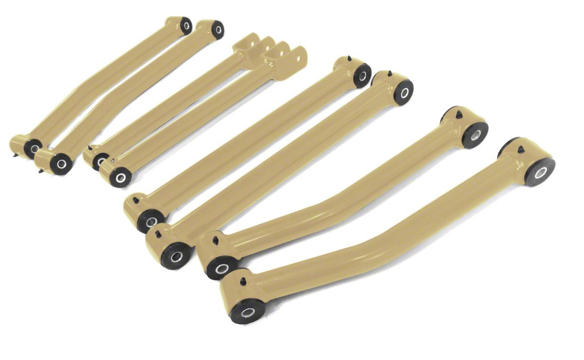 Description. Make: JeepModel: WranglerYears: 2007-2018These Control Arms replace your worn out factory control arms. They are designed to fit Jeeps ranging from 2.5" to a 4.0" suspension lift. They are made in the USA utilizing a polyurethane bushing. DOM tubes are powder coated.Kit Includes:(2) Front Lower Control Arms(2) Front Upper Control Arms(2) Rear Lower Control Arms(2) Rear Upper Control ArmsFactory hardware will need to be reused.Tubing on Upper Control Arms: 1.500" OD x 0.120" W DOM ASTM A513 Type 5Tubing on Lower Control Arms: 1.750" OD x 0.250" W DOM ASTM A513 Type 5Steinjäger manufactures complete lift kits with multiple color options