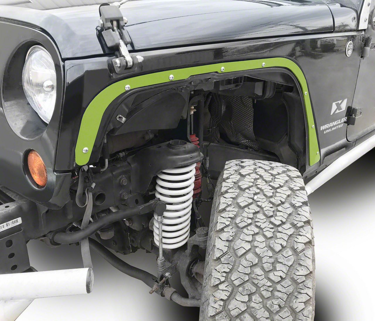 Application. The Steinjager Front Fender Deletes - Gecko Green is manufactured to be a direct fit for all 2007-2018 Jeep Wrangler JK models.