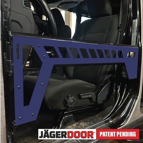 Open-Air Off-Road Experience. The Steinjager JagerDoor Front Trail Doors deliver a rugged and functional solution for Jeep Wrangler JL owners who crave the freedom of open-air driving without sacrificing structure or security. These trail doors provide excellent visibility on the trail while enhancing your Jeep's off-road style with a unique Southwest Blue powder-coated finish. Designed to replace factory doors, they are ideal for adventurous off-roaders looking to elevate their experience.