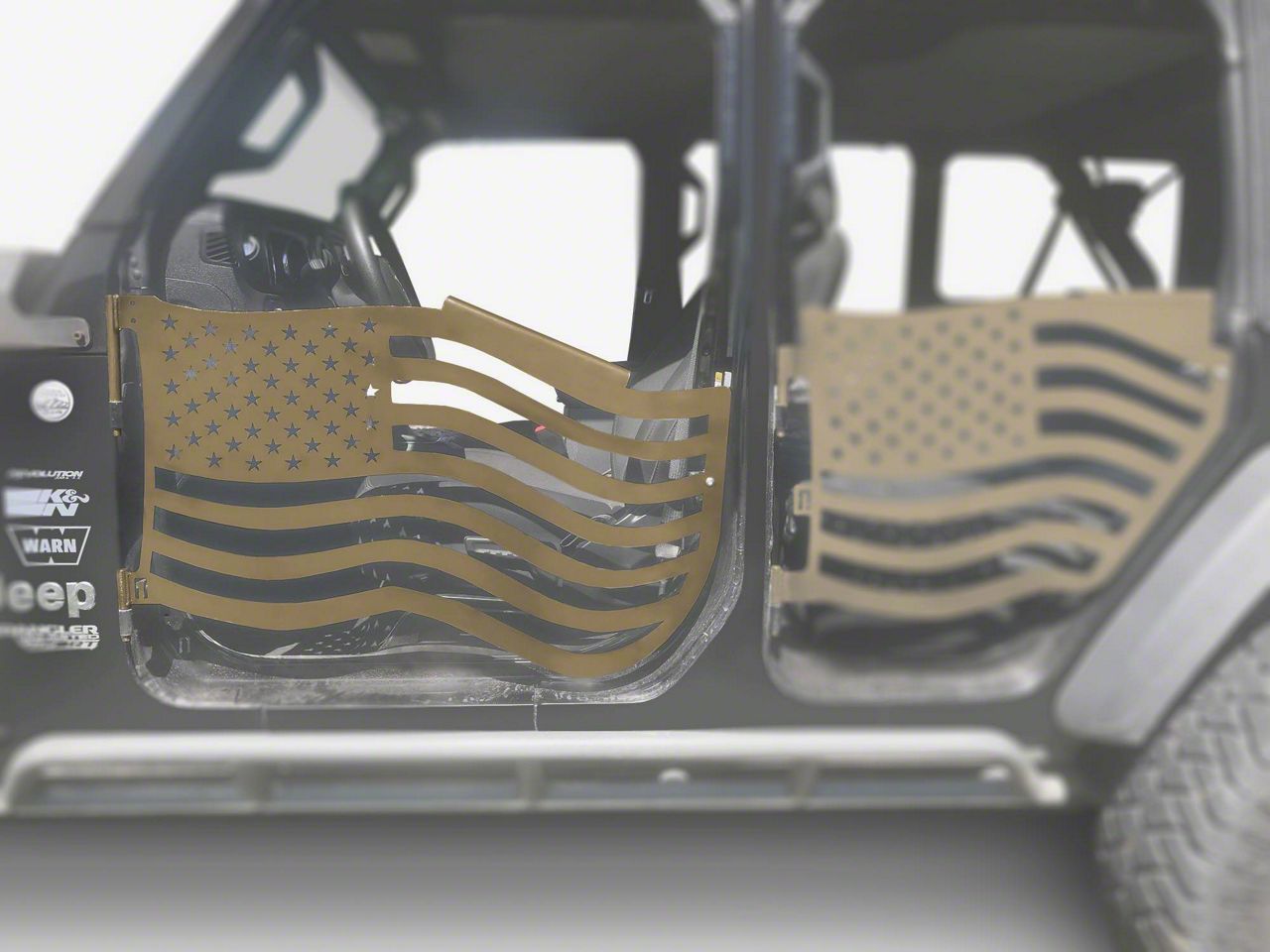 Application. These Steinjager Premium American Flag Front Trail Doors; Military Beige are designed to fit 2018-2026 Jeep Wrangler JL models. Driver and passenger side included.