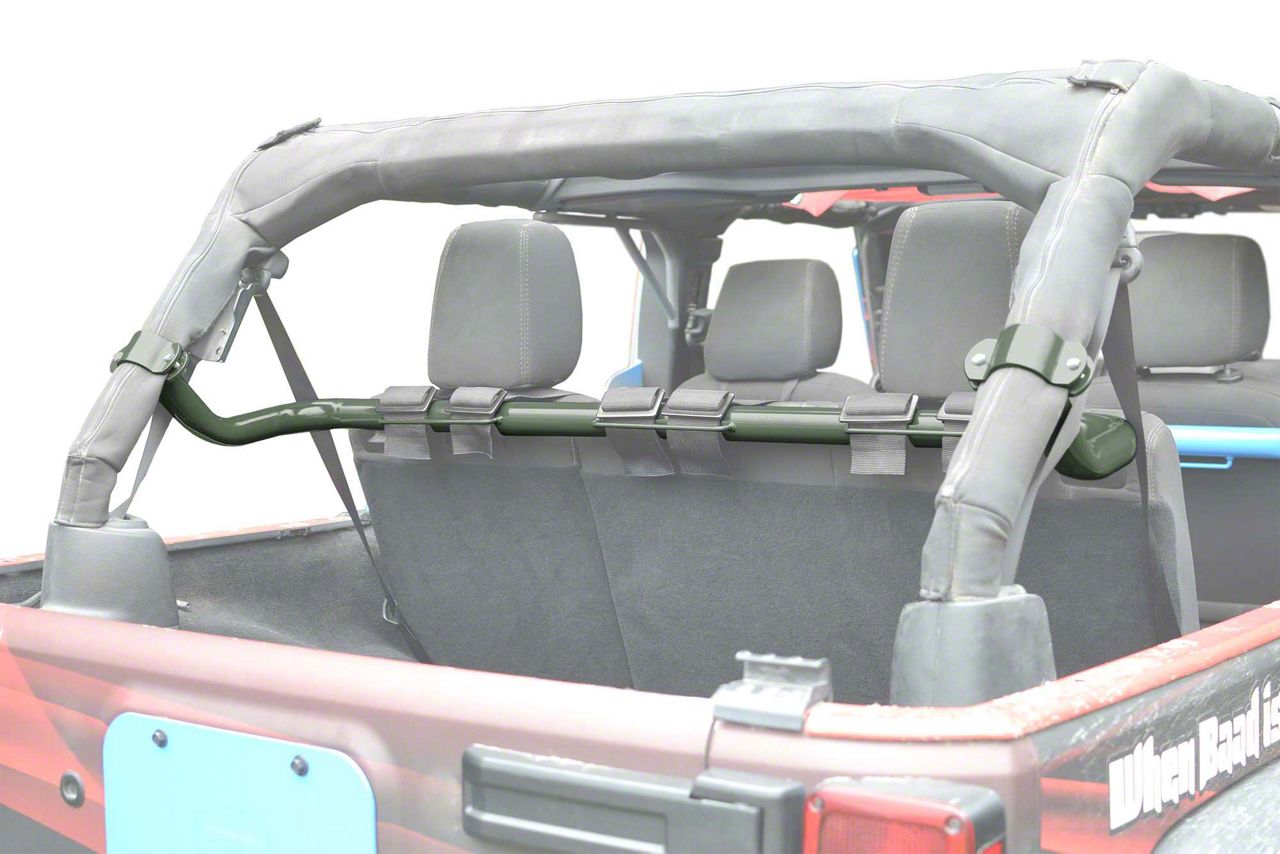 Ideal Strength. Ensure your 2007-2018 Jeep Wrangler JK has the strength and handling needed for your toughest drives by investing in Steinjager's Locas Green Rear Seat Harness Bar. Featuring a design that stiffens up your Jeep's C-pillars, this harness bar enhances the overall handling of your Jeep while adding superior strength to guarantee a powerful drive during difficult off-road missions and adventures. The bar also features stable mounting points for 3 sets of overhead harness shoulder straps, which dramatically enhances your rear passengers' safety and security. A completely unique addition to your Jeep, this bar mounts directly to your rear roll bar.