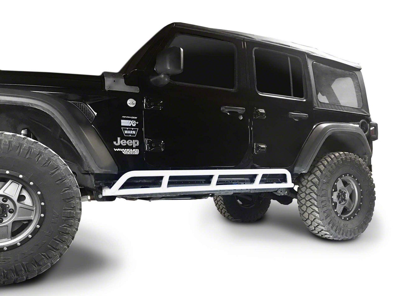Application. The Steinjager Rock Sliders; Cloud White fits all 2018-2026 Jeep Wrangler JL 4-Door models
