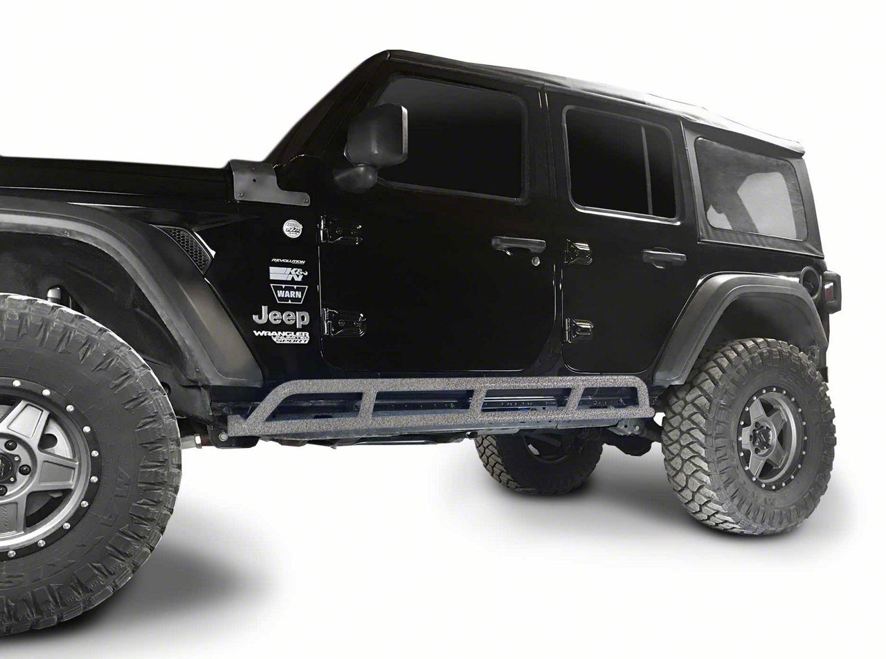Description. Make: JeepModel: WranglerYears: 2018 - PresentFits: 4 Door onlyThese simple to install rock sliders utilize the three body mounts on each side. Simply remove the body bolts and install the rock sliders with the new, supplied hardware.The rock sliders are manufactured using 1.75" tubing to stand up to abuse and give it an aggressive look.