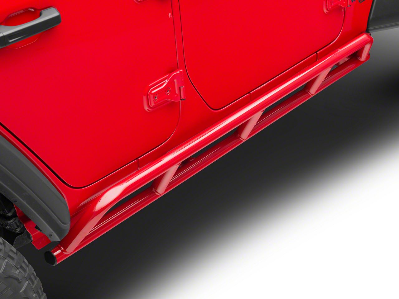 Application. The Steinjager Rock Sliders; Red Baron fits all 2018-2026 Jeep Wrangler JL 4-Door models.