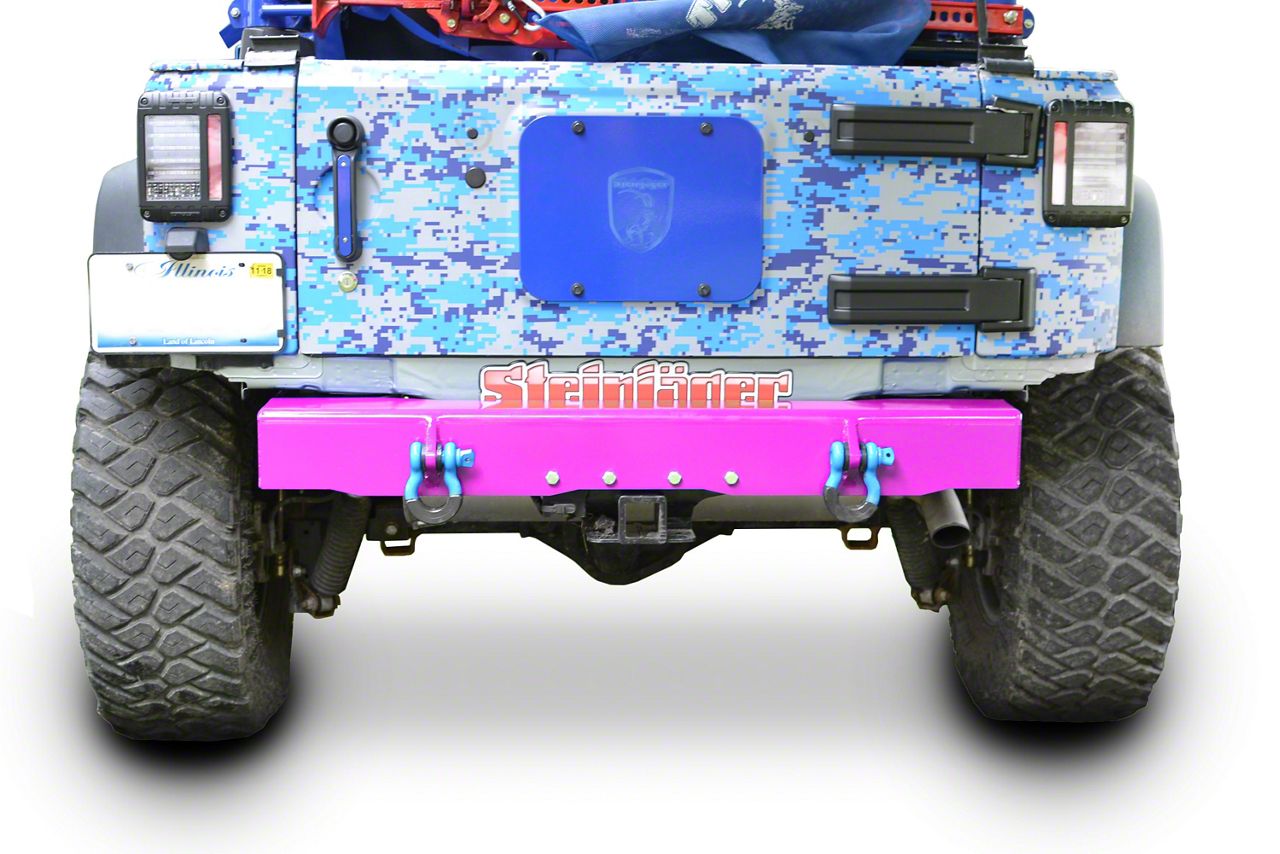 Application. Steinjager's Hot Pink Stubby Rear Bumper with D-Ring Mounts is built to perfectly fit all 2007-2018 Jeep Wrangler JKs.
