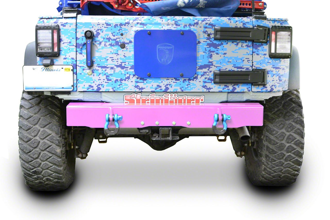 Hardcore Functionality. Steinjager's Pinky Stubby Rear Bumper with D-Ring Mounts is the perfect replacement for your 2007-2018 Jeep Wrangler JK's boring and ineffective rear bumper. With a high-strength build, this bumper manages to keep potentially harmful debris and obstacles from damaging your Jeep's rear end, keeping it in ideal condition so you can focus on the road ahead. The bumper also covers and caps the frame rails and tucks tightly to the body for a sleek new look. Also included on the bumper are 2 D-ring mounts, which improve the off-road functionality of your Jeep (D-rings not included).