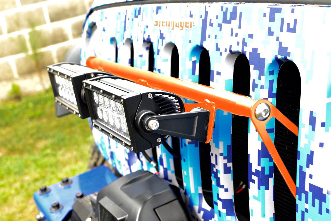 Front Grille Lighting. Project near-field lighting using your front grille with the Steinjager LED Light Bar Grille Mounting Brackets - Fluorescent Orange. These fluorescent orange finish mounting brackets are adjustable, allowing different positions and angles for increased winch clearance. They are proudly made in the U.S.A.