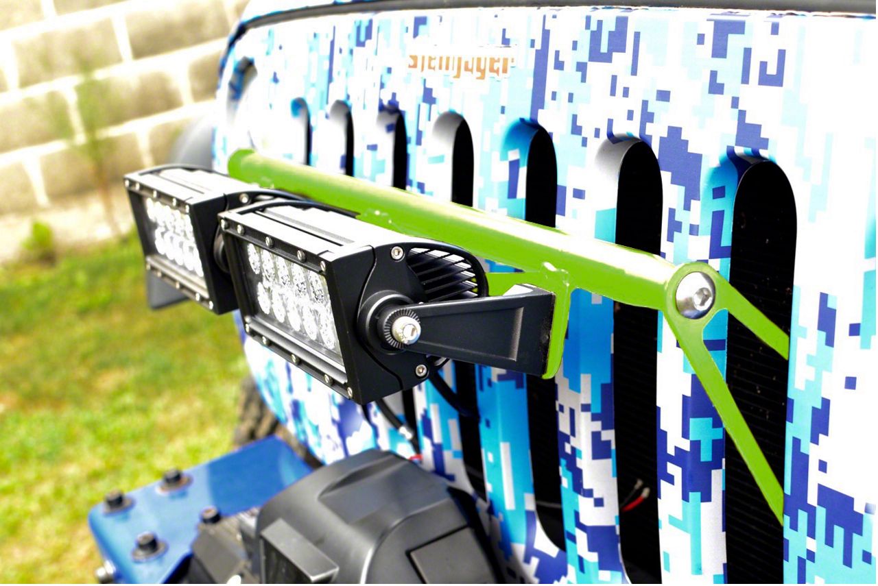 Application. The Steinjager LED Light Bar Grille Mounting Brackets - Gecko Green are compatible with the 2007-2018 Jeep Wrangler JK.