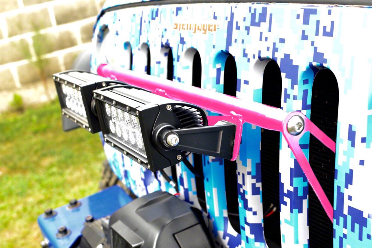 Application. These Steinjager LED Light Bar Grille Mounting Brackets; Hot Pink are designed to fit 2007-2018 Jeep Wrangler JK models. Please note that no lights are included in this kit.
