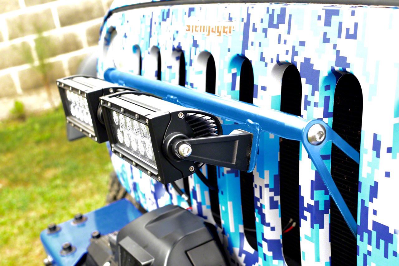 Application. These Steinjager LED Light Bar Grille Mounting Brackets; Playboy Blue are designed to fit 2007-2018 Jeep Wrangler JK models. Please note that no lights are included in this kit.