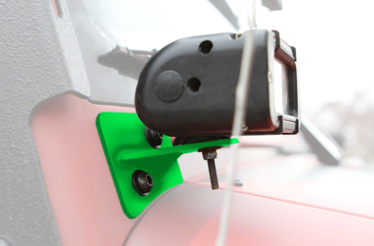 Application. These Steinjager Lower Windshield Mounting Brackets; Neon Green are designed to fit 2007-2018 Jeep Wrangler JK models. Driver and passenger side included. Please note that no lights are included in this kit.