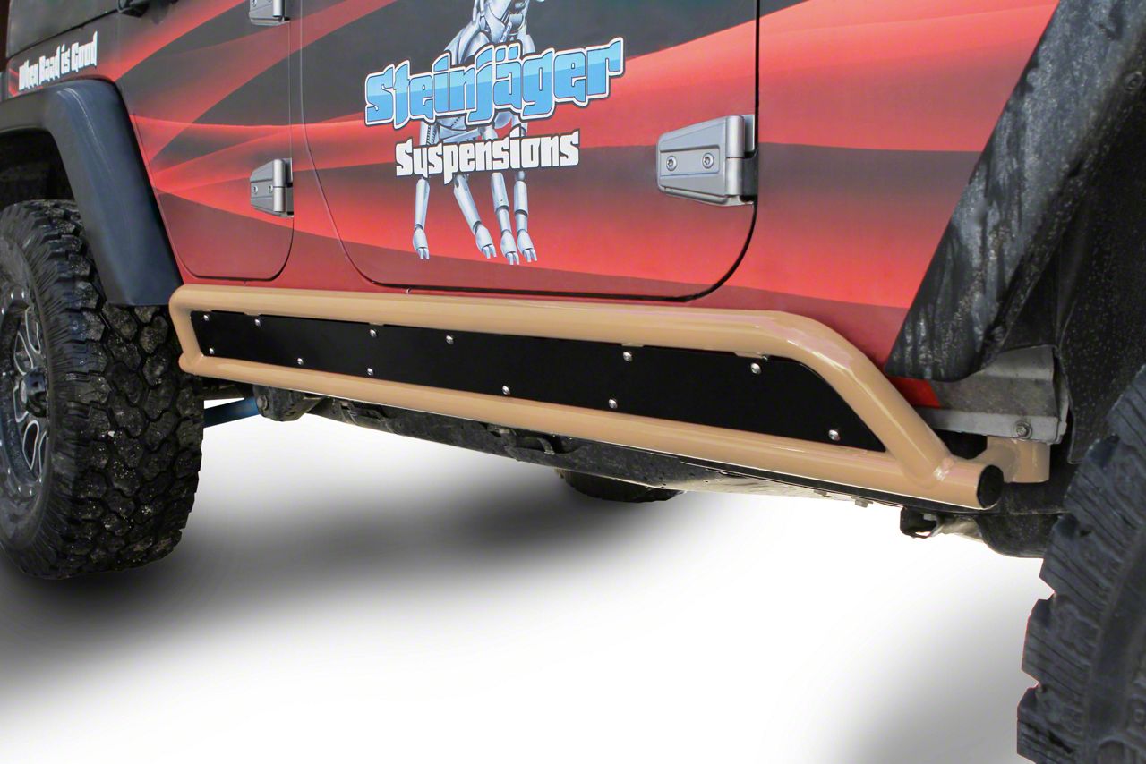 Hardcore Protection. The Steinjager Phantom Rock Sliders - Military Beige allow for the perfect combination of protection and styling, attaching to the left and right side of your body mounts to protect your door sills and bottoms from off-road debris and hard hits from large obstacles. These sliders are proudly made in the U.S.A.