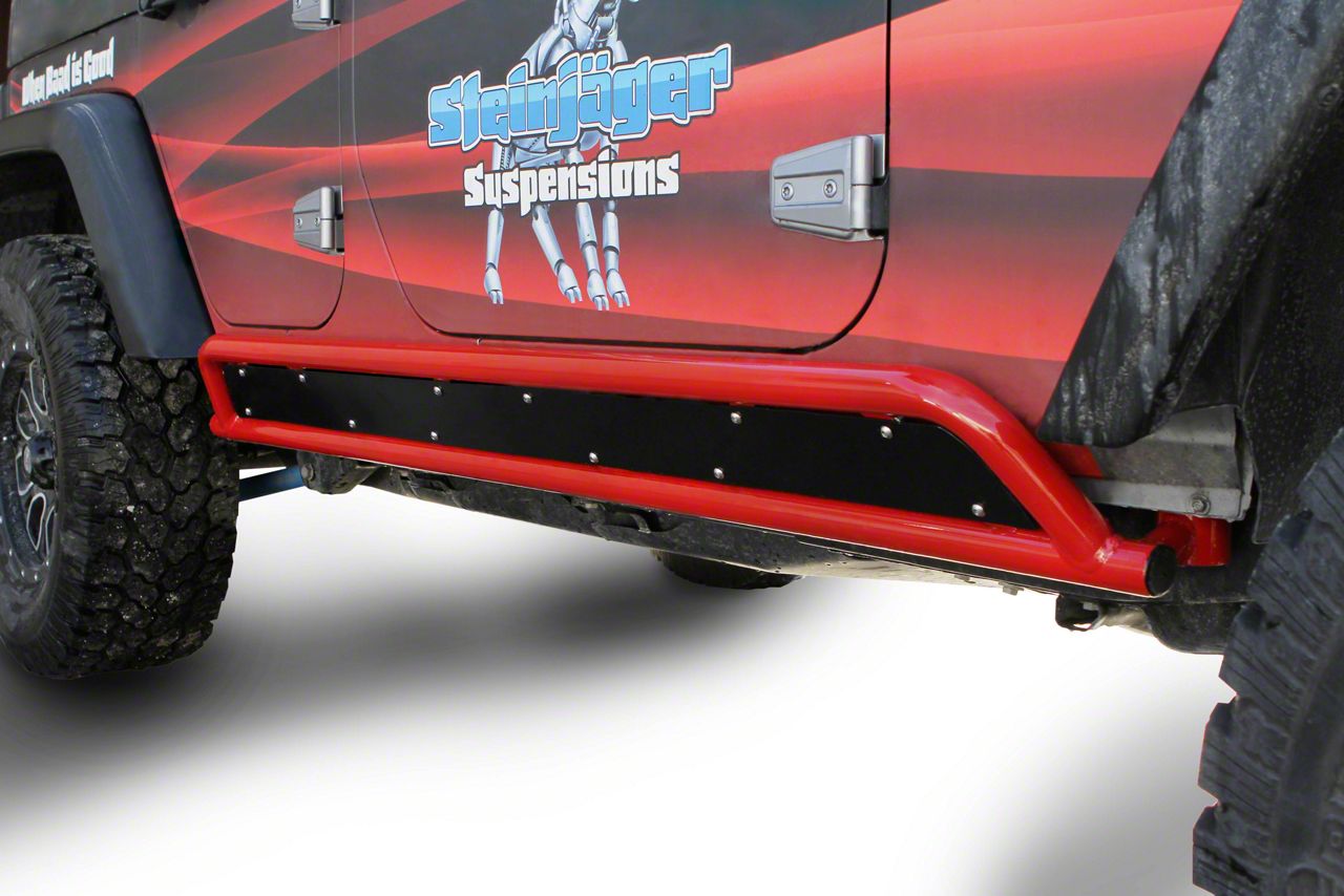 Extreme Quality. Steinjager uses industrial-grade materials to make their rock sliders, ensuring top quality. Constructed with 1.75 in. tubing, indeed, these Phantom Rock Sliders are the perfect companion for your Wrangler on and off the road.