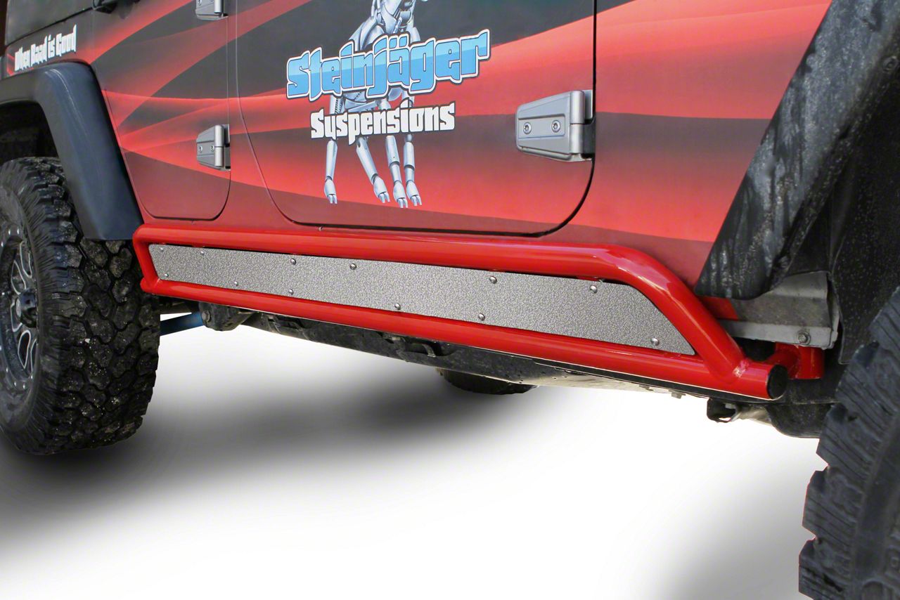 Dynamic Off-Roading. Steinjager wants you to fearless navigate through the challenging rocky and wooded terrains with these Gray Hammertone Inserts mounted on your Phantom Rock Sliders. These inserts are strategically positioned to shield the most exposed and vulnerable rocker panels against various trail hazards.