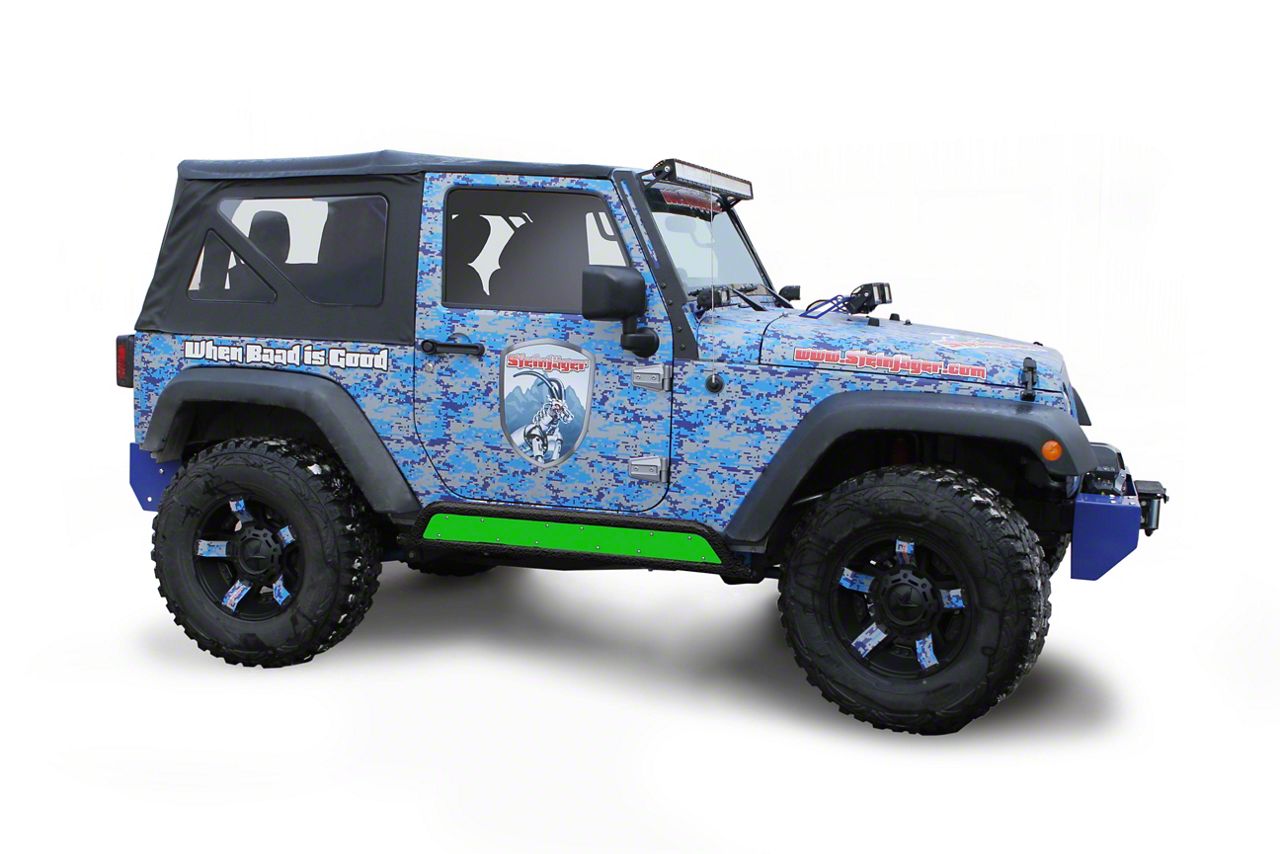 Application. This Neon Green Steinjager Phantom Rock Slider Insert Kit has been designed specifically for 2007-2018 Jeep Wrangler JK 2-Door models with Steinjager Rock Sliders installed.
