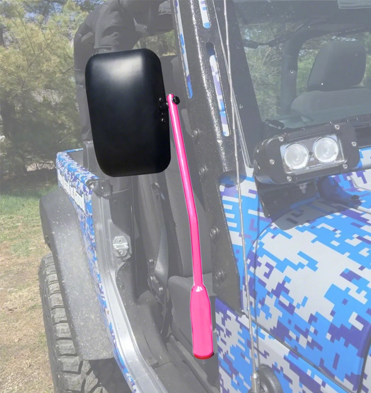 Style and Durability in One. Steinjager’s Premium Mirror Kit is manufactured from the best and most durable materials that are guaranteed to withstand years of off-road abuse. This side mirror assembly comes with a black solid mirror frame and hot pink left and right-hand mounting arms that will surely add a pop of color to your Wrangler.
