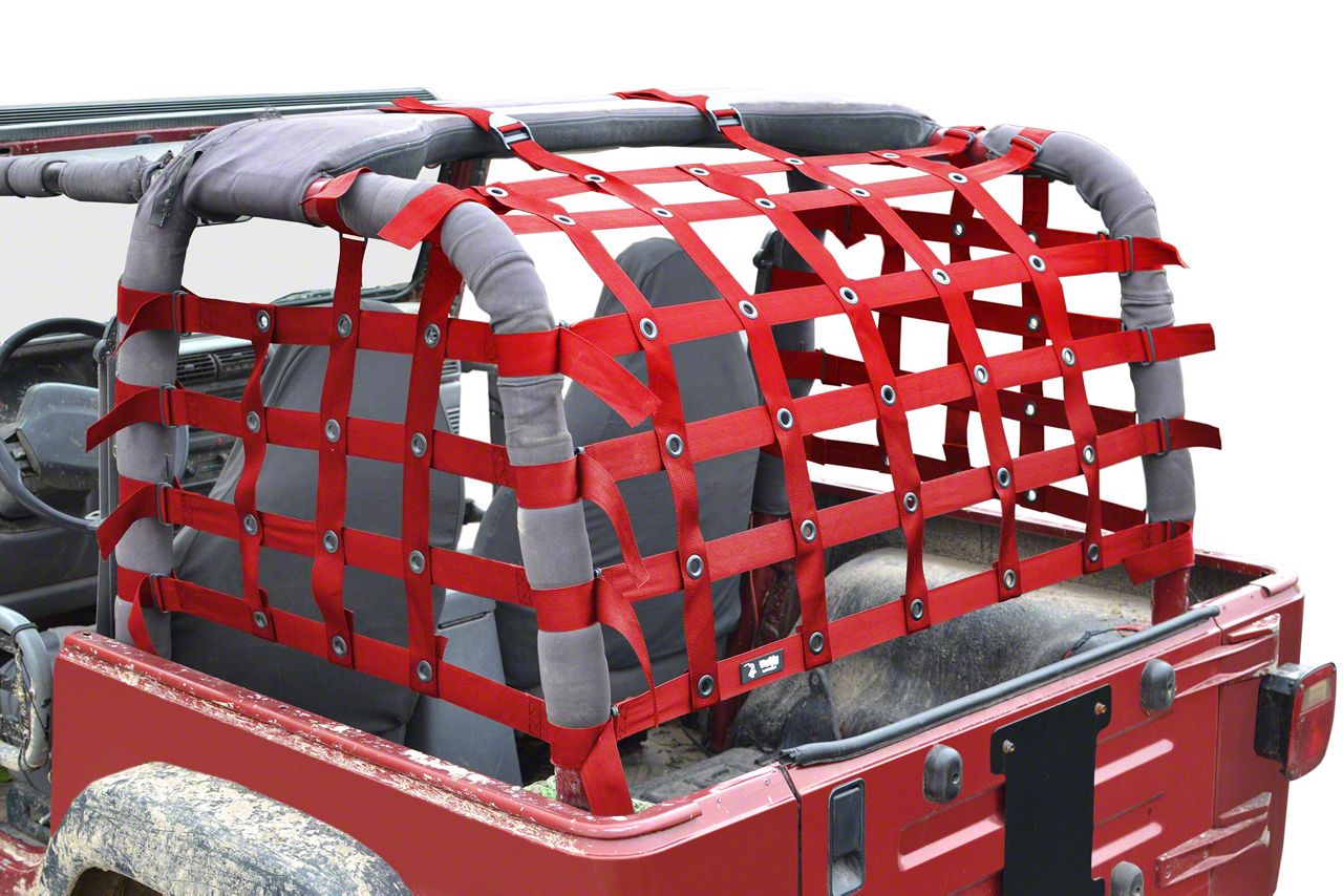 Tough Net Construction. This Teddy® Top Cargo Net features an open design that allows for greater visibility while keeping your cargo inside the vehicle. The cargo net covers the back half and sides of your 2-door Wrangler JK. Steinjager manufactured this cargo net using a strong fabric material in an attractive red color, and reinforced it with black grommets for a solid build.