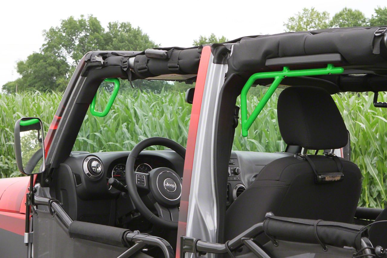 Application. These neon green Steinjager Rigid Wire Form Front & Rear Grab Handles fit all 2007-2018 Jeep Wrangler JK 4-Door models.
