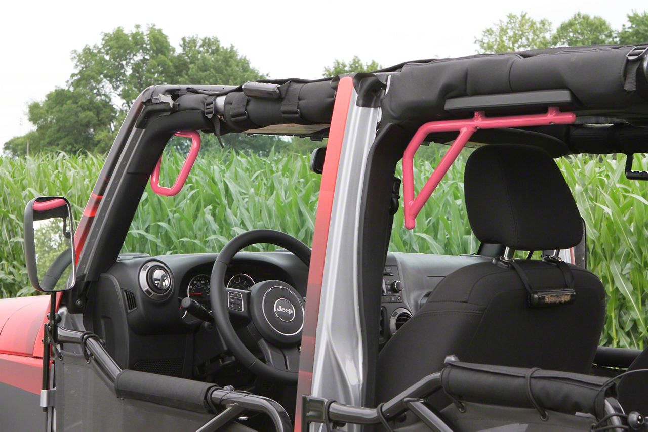 Durable Construction. These Rigid Wire Form Front & Rear Grab Handles from Steinjager were certainly built to last. Made in the USA from top-quality materials, these were designed to be durable and reliable. They also install without obstructing your visors. The bright pink finish also adds a nice, bright touch to your Wrangler.