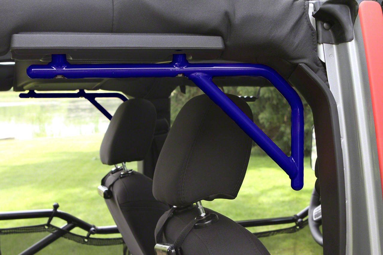 Application. This set of Southwest Blue Steinjager Rigid Wire Form Rear Grab Handles is built for all 2007-2018 Jeep Wrangler JK 4-door models.