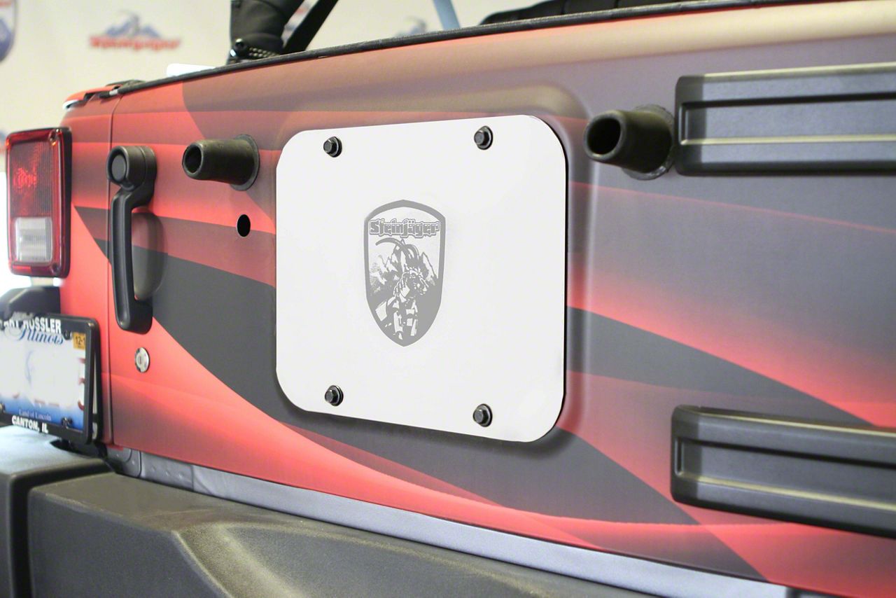 Application. This Cloud White Steinjager Spare Tire Carrier Delete Plate is made for all 2007-2018 Jeep Wrangler JK models.