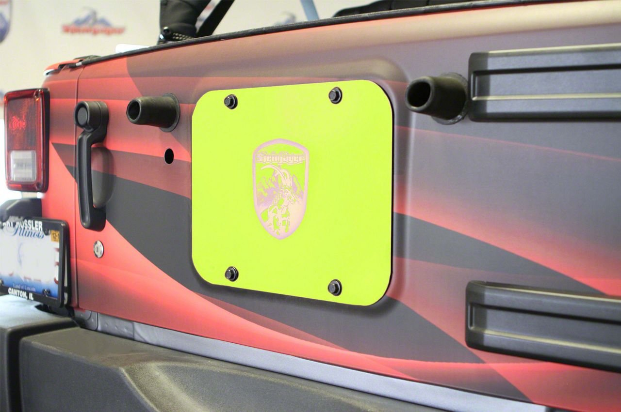 Application. This Gecko Green Steinjager Spare Tire Carrier Delete Plate is specially made all 2007-2018 Jeep Wrangler JK models.