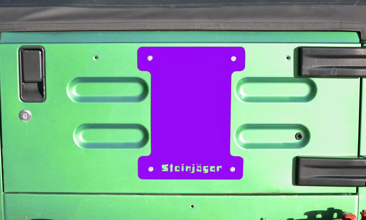 Reliable Shield. Steinjager utilized durable 1/8-inch steel plate for its Sinbad Purple Spare Tire Carrier Delete Plate. This tailgate cover was finished with powder coating for extra protection from trail hazards.