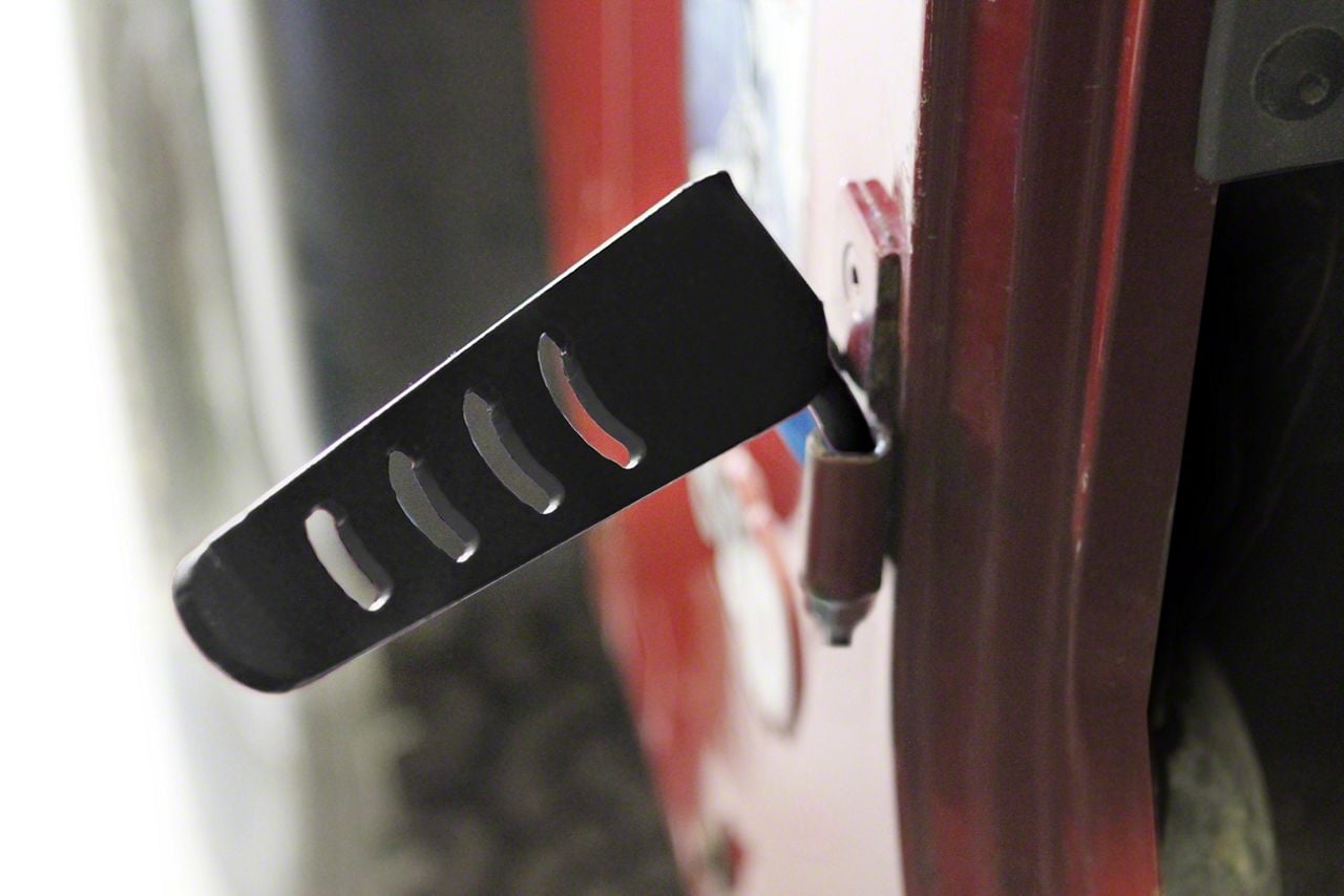 Easy Installation. These TJ foot pegs are easily installed by simply slipping them into the lower door hinge of the Jeep Wrangler with the doors off set-up. The hassle-free installation takes a few minutes.