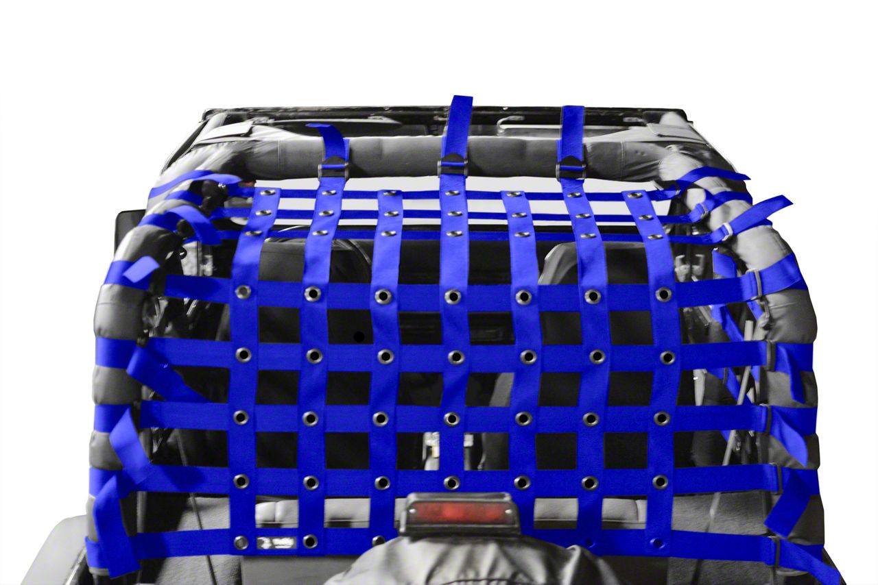 Rugged Construction. Each Teddy® Top Cargo Net features an open design allows greater visibility while keeping your cargo secured. It is manufactured using a premium heavy-duty fabric material in a bright Blue color, and is further reinforced with durable grommets for a more solid hold. This cargo net covers the back half and sides of your Wrangler YJ.