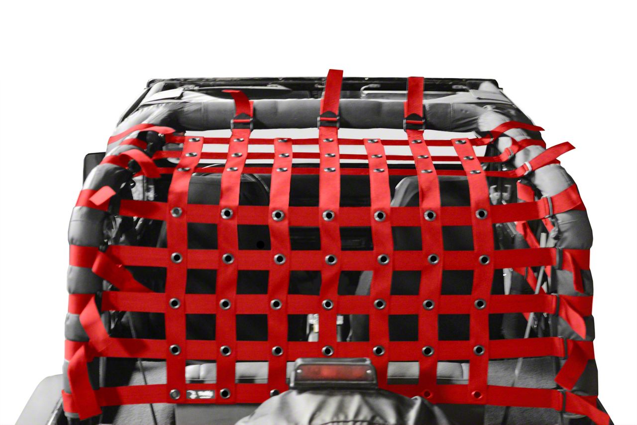 Efficient Cargo Protection. Ensure nothing will fall off your Wrangler YJ no matter how rough the terrain is with the Steinjager Teddy® Top Cargo Net Kit in Red. This fashionable cargo net offers a symmetrical look to your Jeep while securing your items from loss and theft. With Steinjager Cargo Nets, you can ride challenging off-road trails in style with peace of mind.