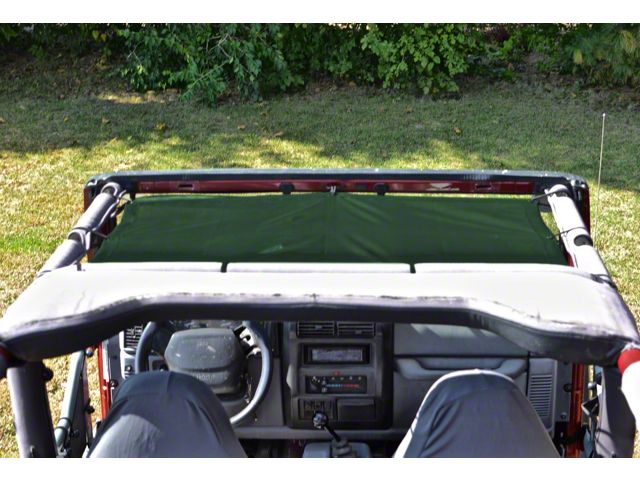 Application. The Steinjager Teddy Top Front Seat Solar Screen Cover - Dark Green is manufactured to a perfect fit for all 1997-2006 Wrangler TJ models.