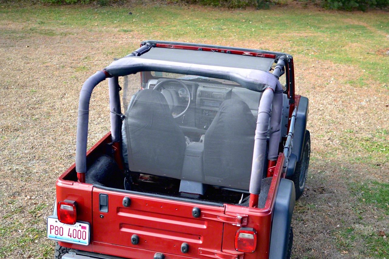 Quality Design. The Steinjager Teddy Top Truckster – Gray is the perfect addition to your Jeep Wrangler TJ if you want to get some shade while enjoying an open-air experience when taking to the road and trails. It will provide limited protection for the driver and passenger. This screen top delivers partial shade and was designed to allow visibility.