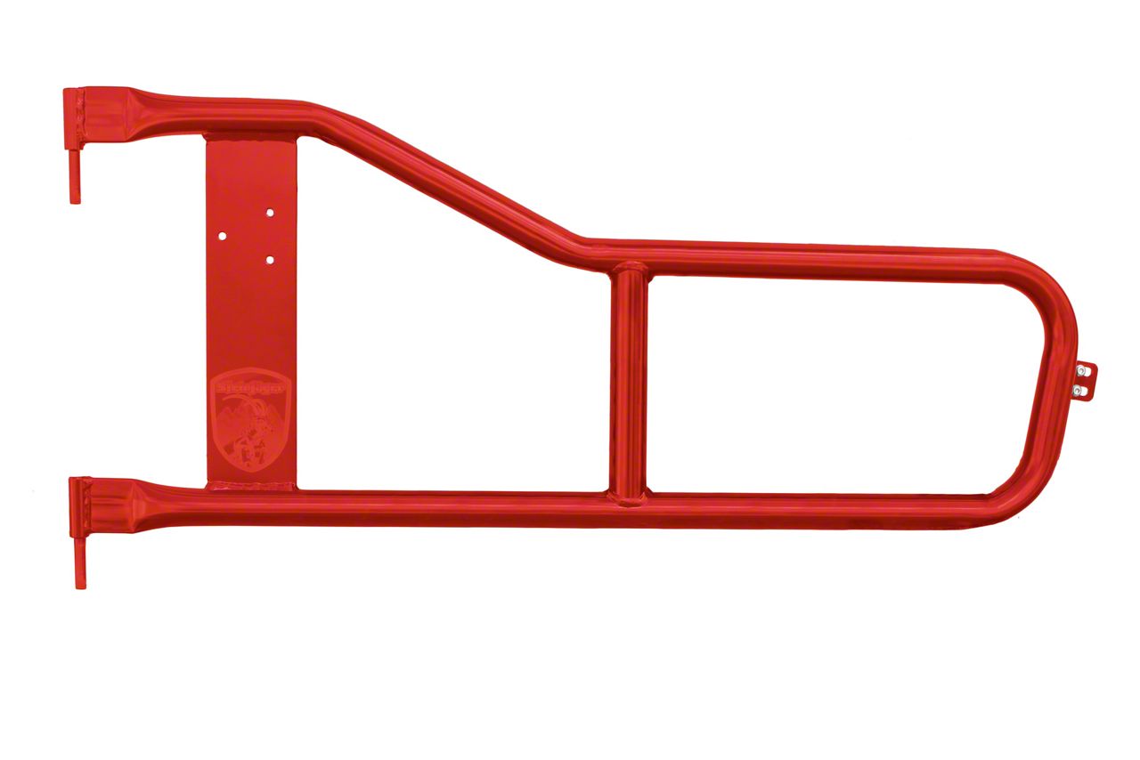 Hardcore Construction. These Trail Tube Doors are created with a quick release detent pin and weather resistant cable that keeps the pin safe as well as a custom machined door hinges that allow for a quick and easy replacement of your old doors. Created in America from 1.25 inch tubing for unbeatable durability despite rigorous conditions, these doors are guaranteed to provide the support you need at all times. The doors are also finished with a red baron powder coat that not only adds an eye-catching accent to your Jeep but also guards against rust and corrosion for long-lasting durability.