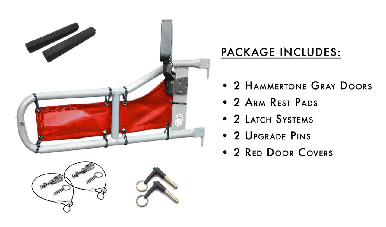 Feel One with Nature. Get to really feel one with nature when you install your Jeep with Steinjager Hammertone Gray Tube Doors with Red Mesh Covers. Steinjager Trail Tube Doors really opens up your Wrangler while still providing the security of a barrier between you and the road. Plus, Steinjager Trail Tube Doors look give your vehicle that off-road-ready look it deserves.