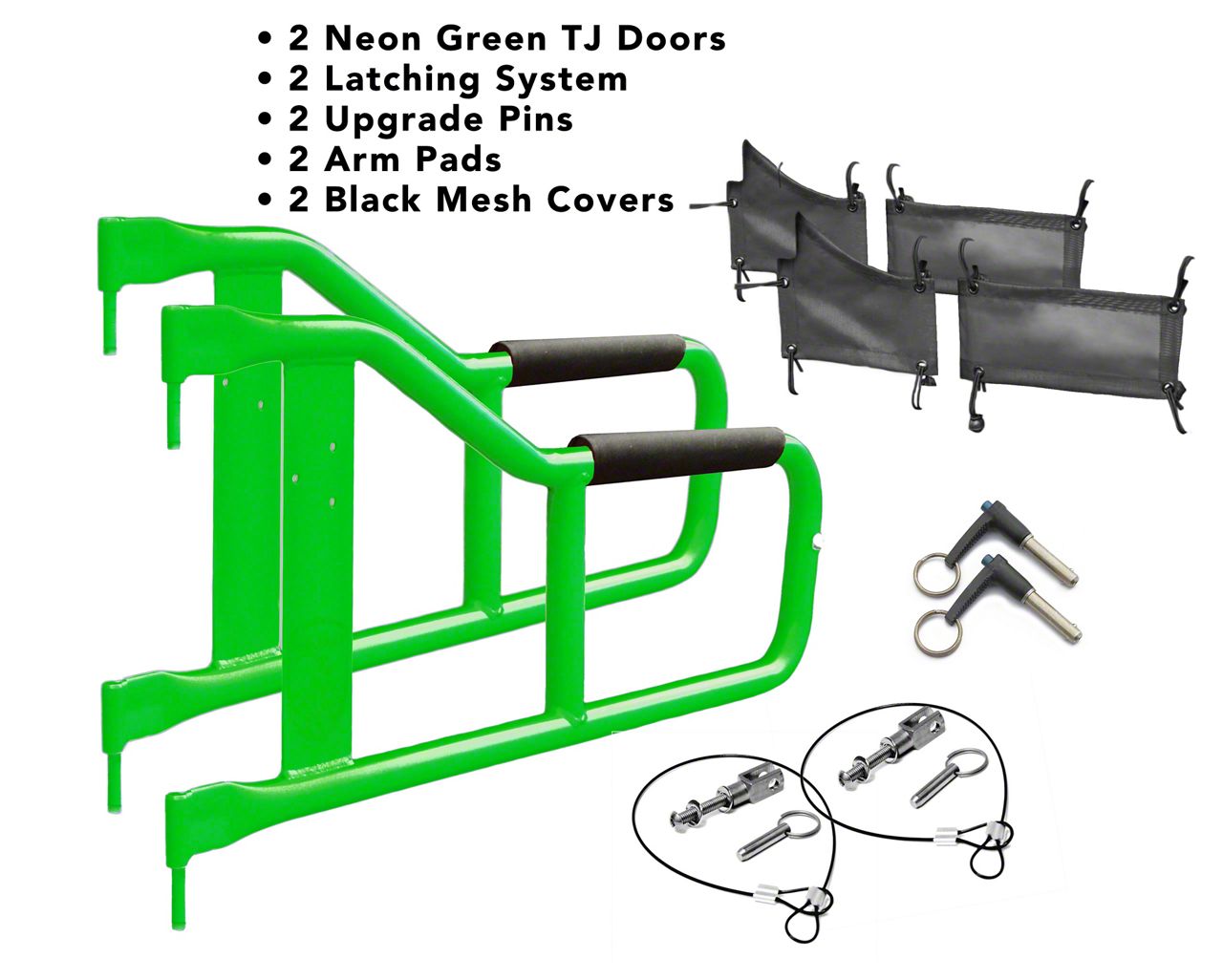 Application. Steinjager Neon Green Tube Doors with Black Mesh Covers fit all 1997 to 2006 Jeep Wrangler TJ models.