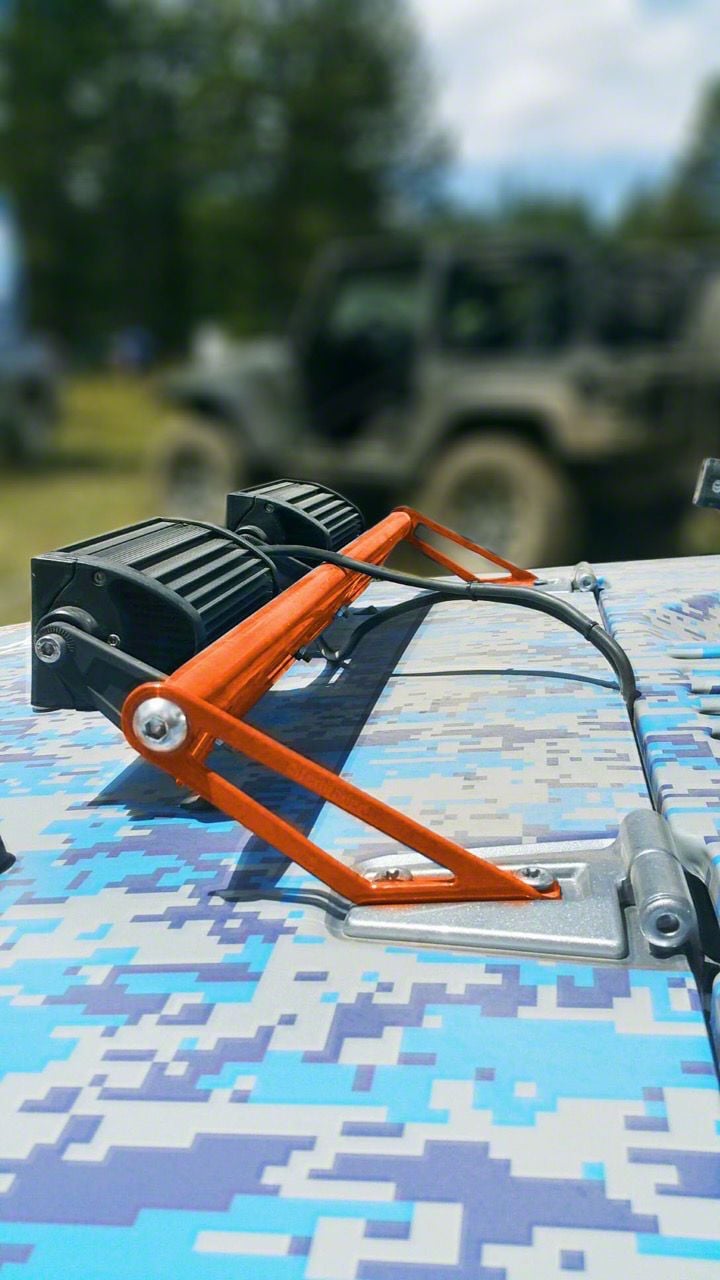 Application. Steinjager Two 8-in. LED Light Bars with Fluorescent Orange Hood Hinge Mounting Brackets fit all 2007 to 2018 Jeep Wrangler JK models.
