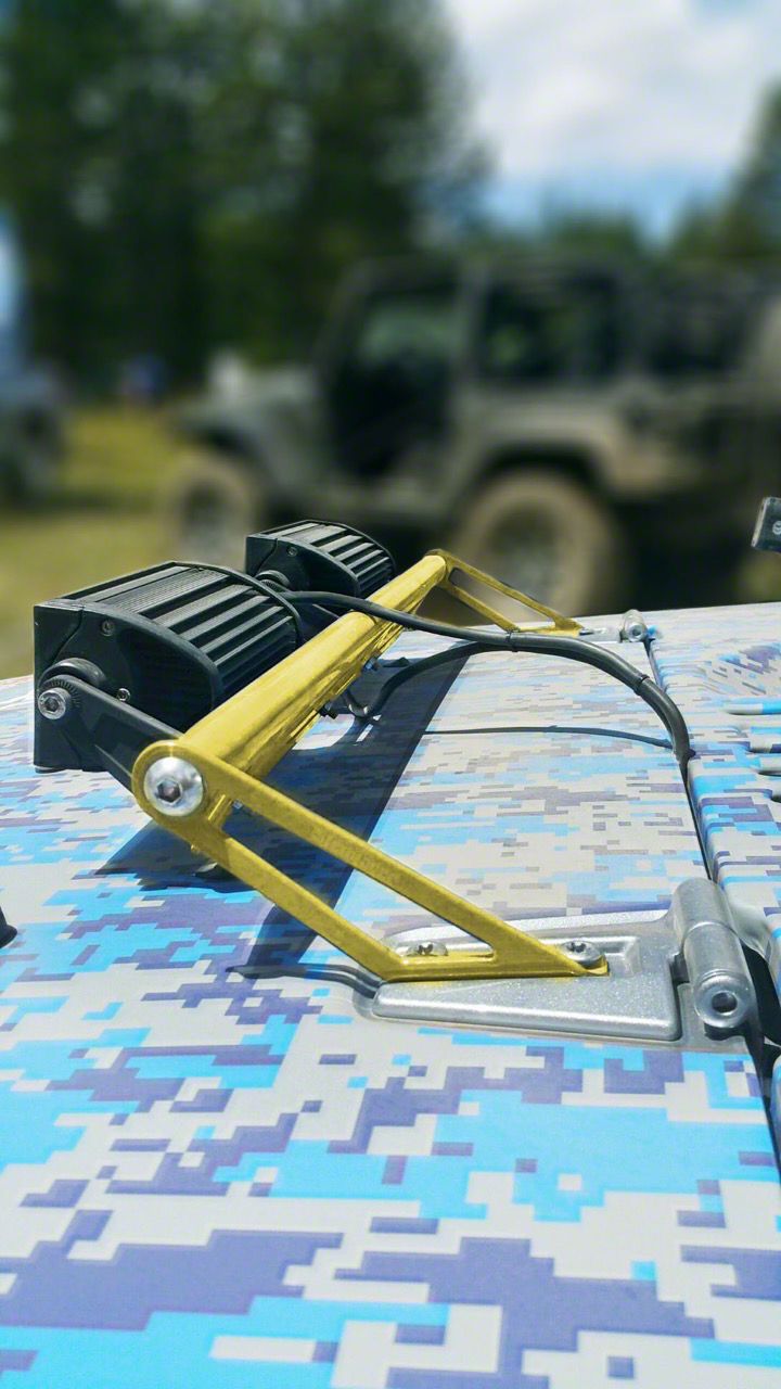 Application. Steinjager Two 8-in. LED Light Bars with Lemon Peel Hood Hinge Mounting Brackets fit all 2007 to 2018 Jeep Wrangler JK models.